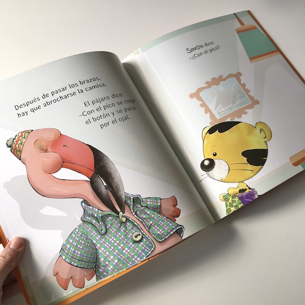 A la hora de abrocharse la camisa, verá que el flamenco pasa los botones por el ojal ayudándose con el pico. ¡Pero Simón no tiene pico!