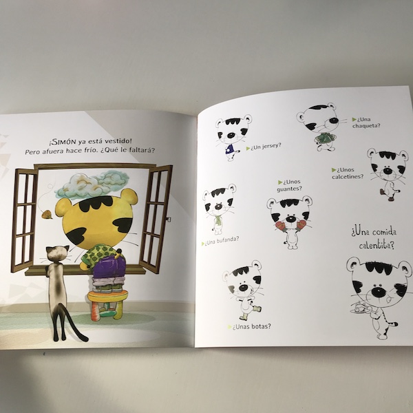 Una vez que Simón está vestido, el libro va a preguntar al pequeño lector si le falta alguna prenda teniendo en cuenta que fuera hace frío. Le propondrá, también, cómo vestirse en caso de que llueva o haga mucho calor.
